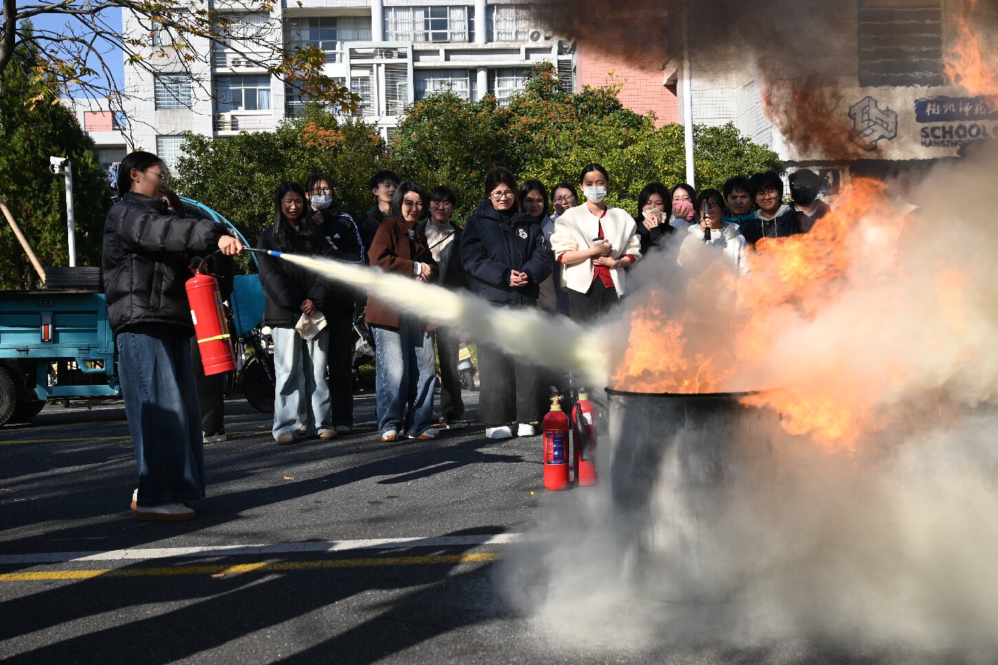 为进一步巩固演练成果,当天下午,部分师生代表还参与了灭火实操演练。在安全保卫处工作人员的指导下,大家手持灭火器,亲身实践“提、拔、握、压”的操作步骤,近距离感受灭火过程,将消防安全理论知识转化为实际操作能力。