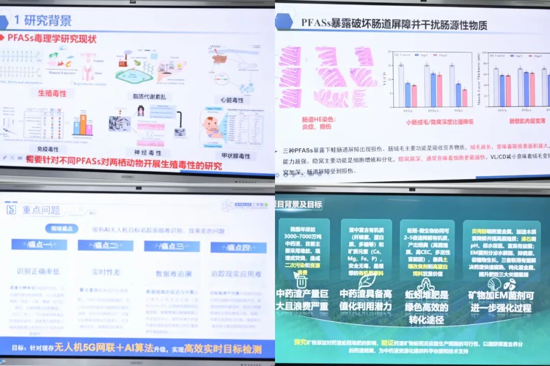 答辩现场遵循“项目汇报+评委点评”的流程,各项目代表通过PPT直观呈现研究进程与阶段性成果,随后接受评委老师的专业提问与针对性指导。本次参与答辩的项目覆盖人工智能、生物科学、工业设计、机械设计制造等多个前沿领域,既有紧扣国家战略与社会需求的创新探索——如结合生育导向与AI技术的“AI智能设计介入下的非遗剪纸结合婴幼儿产品应用研究”、响应美丽中国建设的“无微不‘治’——微塑料及其添加剂的生物学效应研究”。
